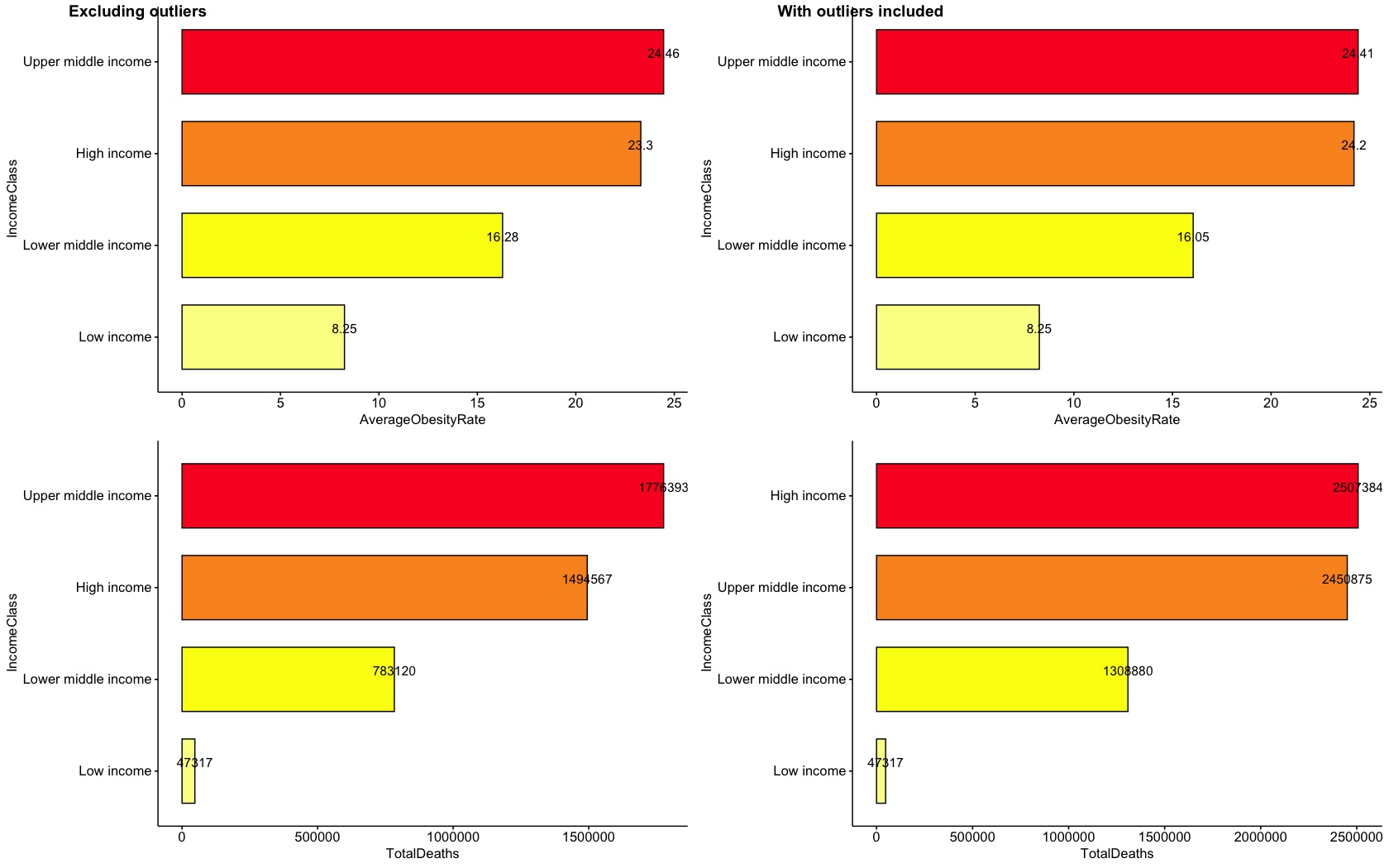 To investigate their positions, I looked at the correlation between covid deaths and obesity rates of countries in the world grouped by income(GNI Per Capita income classification). I will keep the analysis focused on obesity rates and covid deaths by income and post a question on diabetes, which came up often when invesitgating the outlier countries.