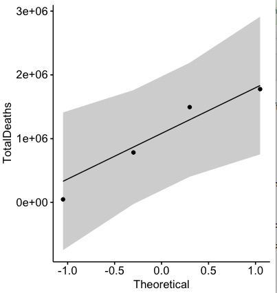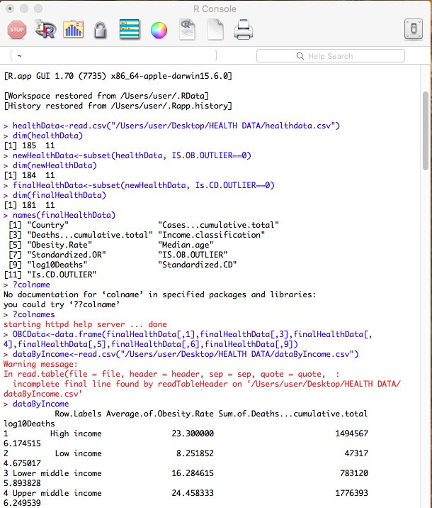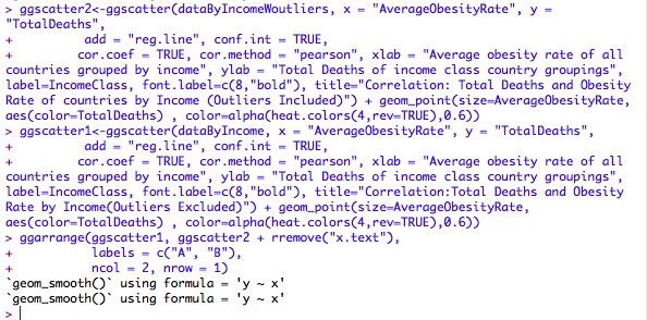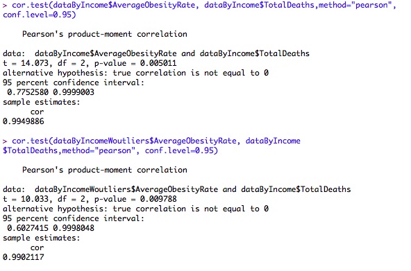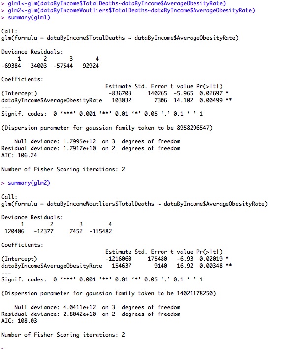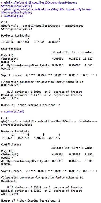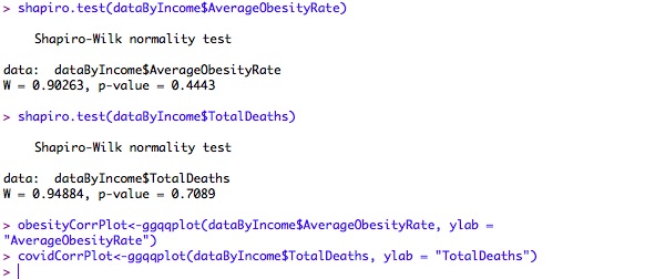 The health data was read into R in csv format and 4 outliers excluded from the final data. Data grouped by income (excluding outliers) was also read into R for further analysis P-value of shapiro test > 0.05 means we fail to reject the Null Hypothesis that data distribution is significantly different normal. QQplots are a visual check that confirm the covariation beteen variables is linear and correlation of variables with normal distribution. We will use the Pearson Correlation test with a 95% confidence interval for Data by Income with excluded outliers and with included outliers. Below is the code for generating scatterplots Running the correlation test to obtain the confidence intervals and actual R and p-values. Now that we have established that the variables are correlated (~.99 R) and linear, we can fit a linear regression model to explain the relationship between covid deaths and obesity rates as country incomes rise. Both linear models (included outliers and excluded outliers) show a significant linear relationship between deaths and obesity rates with p-value <0.05 = 0.043 glm 1 : Total Deaths = -836703 + 103032*ObesityRate + E glm 2 : Total Deaths = -1216060 + 154637*ObesityRate + E However the standard errors associated with the model are too large which brings to question the suitability of our linear regression Model. I fitted a log linear model this time, using log10 transformed covid death data This time, only the log linear model that excludes outliers gives a significant relationship between covid deaths and obesity rate p<0.05 = 0.043.