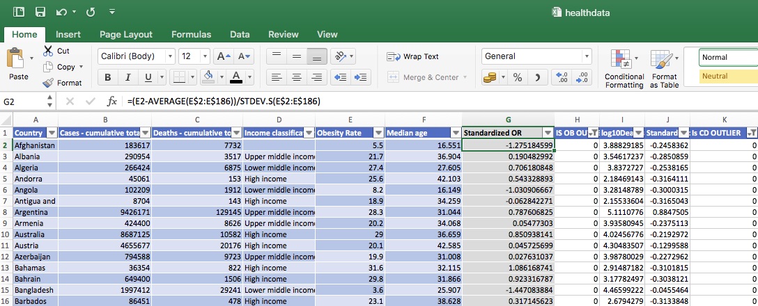 The data was coded 0 or 1 if they were outside the range (-3.29,3.29) into variables IS.OB.Outlier and Is.CD.Outlier in Excel.