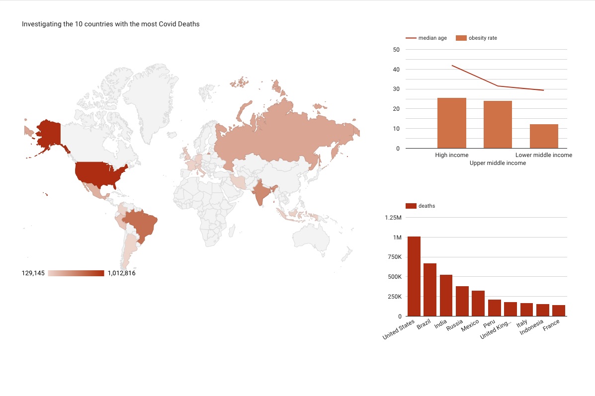 If you were to zoom into India ,the 3rd highest covid deaths in the world, a lower middle income country yet with a low obesity rate of 3.9. However, as noted before, India has the 3rd highest prevalence of Type 1 diabetes according to 2022 data from Medical News Today. As incomes grow, countries urbanize and citizens obesity rates tend to grow significantly contributing to higher chances of covid deaths. However, more variables like Type 1 Diabetes noticed in outlier countries, and other factors need to be investigated for a better description of the relationships with Covid deaths.