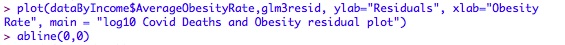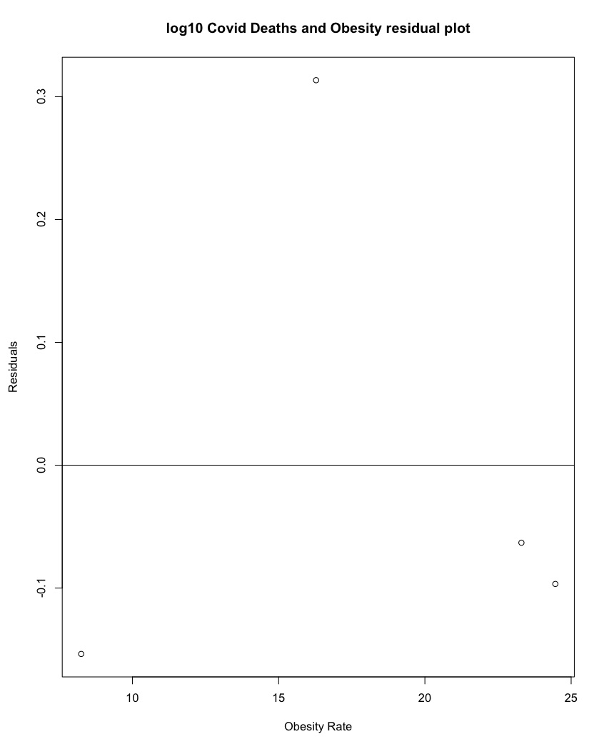 This relationship is descibed by the log linear model below glm 3 : log10Deaths = 4.05631 + 0.09362*ObesityRate + E A plot of the residuals (E) from the log linear model with excluded outliers (glm3 ) to see whether the model suitably explains the data is done below. It shows varying distances from the mean with the second residual being much futher from the mean This suggests that our current regression is not enough to explain covid deaths. There are missing variables or interactions in the